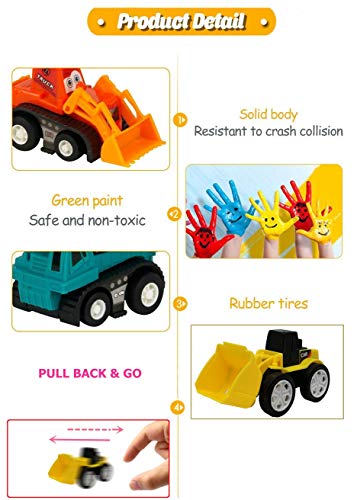 Flexible Pull Back Car: Pull the car back, then the car go fast, suitable for playing indoors and outdoors. No batteries required, with smooth surface and flexible rubber wheels, convenient and interesting for kids.do you want to get realistic construction vehicles toys for your little one? Our super pack of pull pack vehicles are realistic with joints that swing and other features that will certainly keep kids of preschool age entertained.Each of our toys are extremely easy to use!