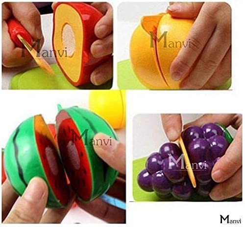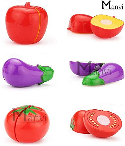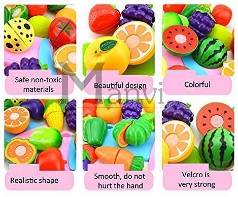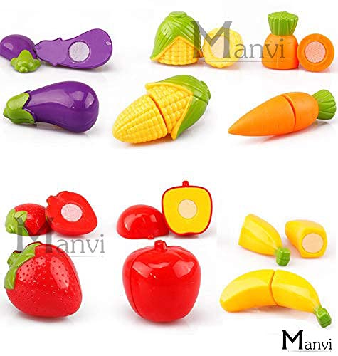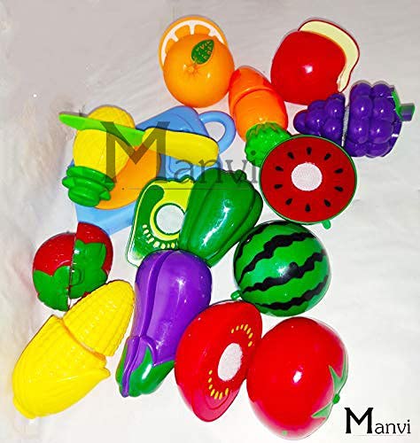 Includes 15 Pieces — apple, pineapple, strawberry, orange, watermelon, banana, grapes, tomato, carrot, corn, brinjal, capsicum, lemon, chopping board and knife.