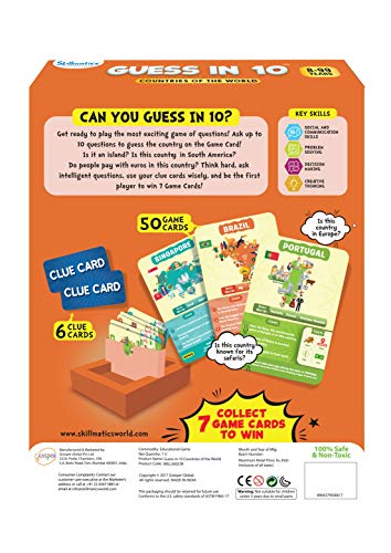 Get ready to play the most exciting game of questions! Ask up to 10 questions to guess the country on the game card! Is it an island? Is this country in south America? Do people pay with euro sham in this country? Think hard, ask intelligent questions, use your clue cards wisely, and the be the first player to win 7 game cards! This game includes 52 game cards and 6 clue cards.