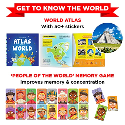 DEVELOPS LOGIC, LANGUAGE, A LOVE FOR SCIENCE & MORE: The Spelling puzzle & Workbook develops language & logic. The Atlas & Memory game helps brain development and helps kids to learn about the world around them. The Science kit develops curiosity and builds a love for science.