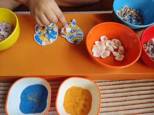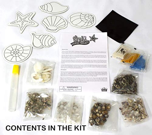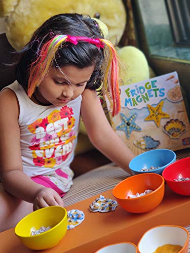 HOW DOES IT WORK? – Using the craft glue provided in the kit the shells can be stuck to the shell-shaped mountboard cutouts to make these mini fridge magnets. The coloured sand is stuck in the empty spaces followed by sticking the rubberized magnet pieces on the back of the cutouts. The activity is quite simple and keeps children busy for hours.