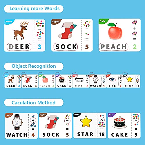【A must have toys for Enlightenment 】Includes one tray, 10 dices with letters on six sides, 20 number tiles, 5 tiles of mathematical symbols, 32 double-sided words flash cards with vivid pictures on it. With this simple basic toy set, kids could achieve a lot—identify letters, relate objects with words, practice spelling, recognize number and solve math problems