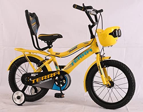 16T Kids Bicycle with age group 5-7 Years in premium model with features like Steel/Spokes Wheel with Tubeless Tyre, In Built Carrier, steel frame, heavy side training wheels, fancy fenders, Big Basket, Color Pedal, Soft Handle Grip, New design backrest