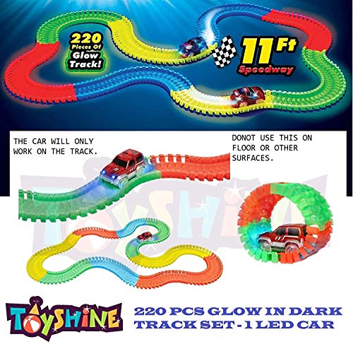 TRACK CAN BE TWISTED AND BENT Great for boys and girls of all ages, this track car set is perfect for kids who love pushing race cars along on tracks These battery-powered toys also light up so they can be used at night for long-term fun and enjoyment. The track toy can be twisted, turned and bent to create different track shapes, allowing your child to enjoy different styles and scenes. The car toy body is comfortable and round, suitable for children to grab. Enjoy active playtime with this glow in the dark race track and race car set for kids, perfect car track for kids.