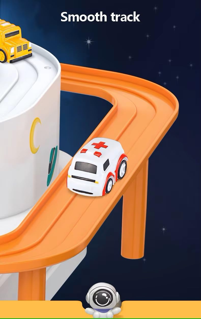 Space Orbit Adventure Theme: The playset features an imaginative space orbit challenge, offering children a thrilling adventure as they navigate vehicles through the cosmic-themed track. This fun theme encourages imaginative play and creativity.