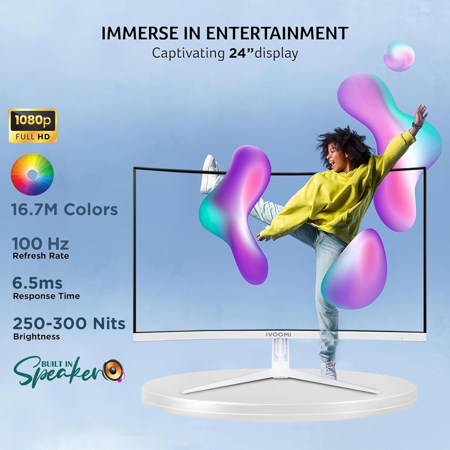 [24 Inch Curve FHD Monitor with Built-In Speakers]: This 24-inch curved Full HD monitor offers an immersive viewing experience with 1920 x 1080 resolution and built-in speakers for clear audio. It’s perfect for multitasking, gaming, and entertainment, all within a stylish, space-efficient design.